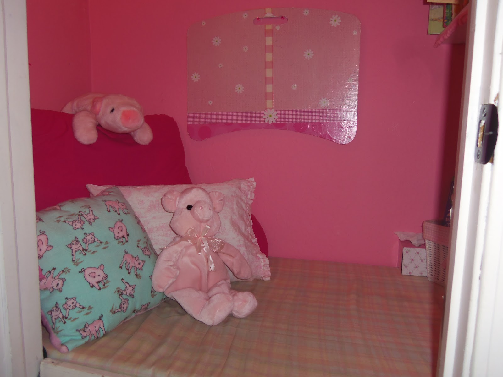 A view inside. She has a pink arm pillow and a few other small pillows and some of her pig collection. |